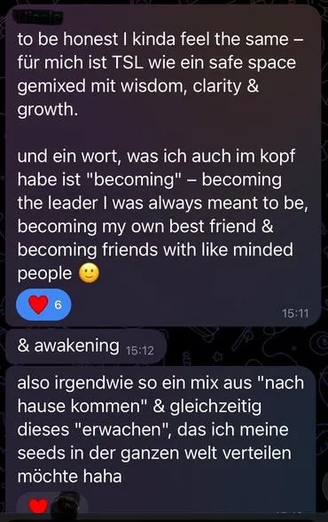 Our previous assistant, Carina, is interviewing our first mama and daugther duo – who have been clearing out so much during the time in TSL, learned so much about themselves and created a strong bond. We are so glad we were able to witness them grow and step into their own unique Soulful Leadership.
